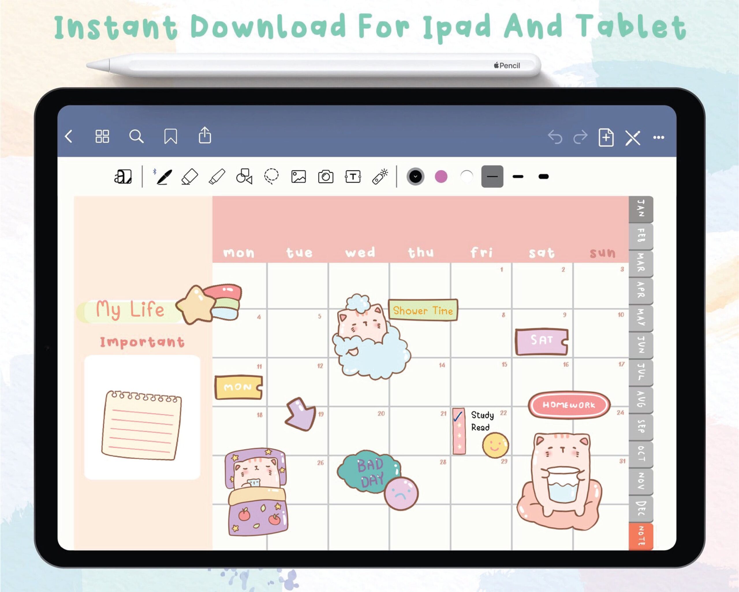 Add a cute various stickers to your digital planner to remind your important events. With logs, to-dos, post-it notes, flags and so much more, these stickers will help you maintain planner functionality in style.