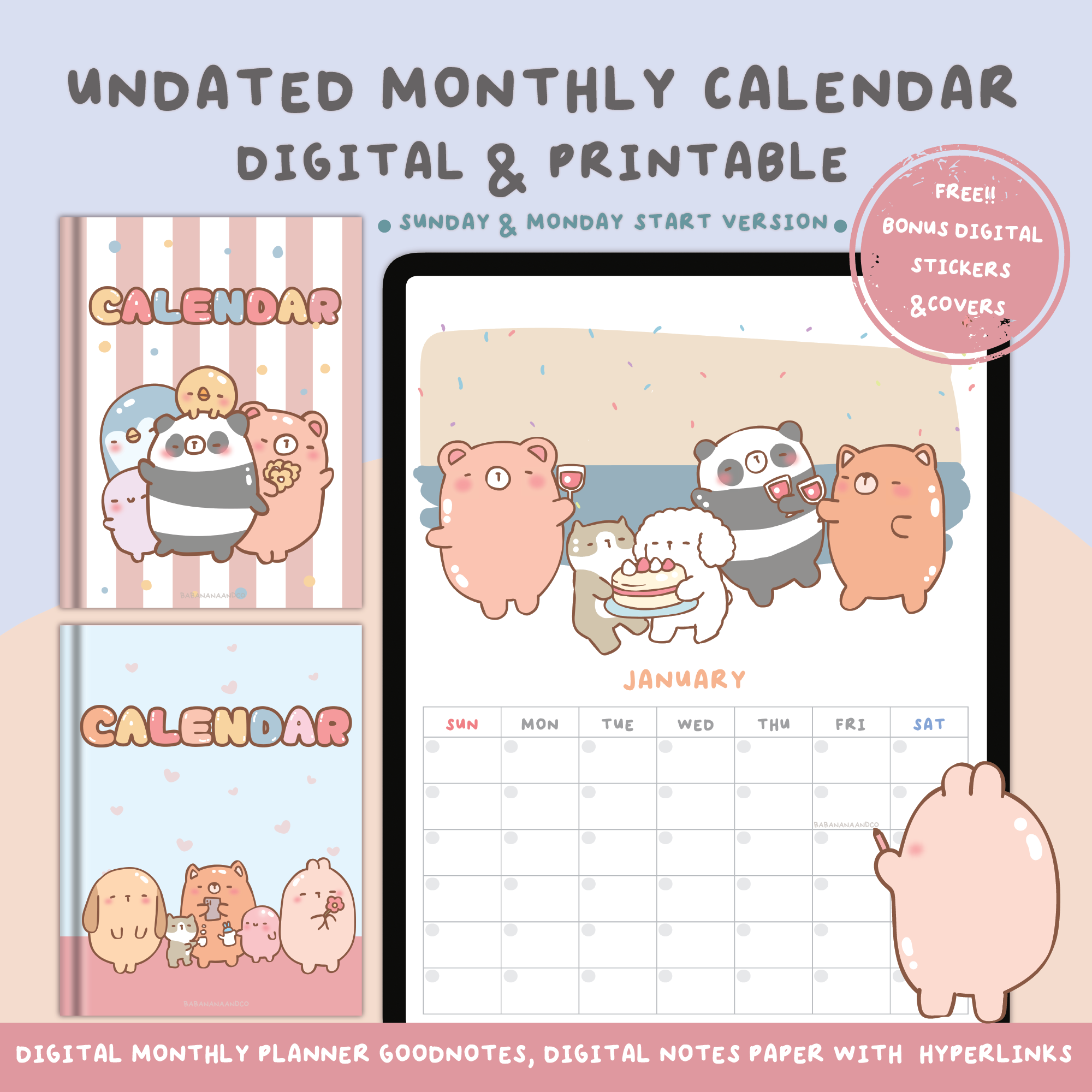 Reusable Undated Digital Planner | Blank Calendar | Cute Monthly Calendar & Organizer with Hand-Drawn Stickers | Sunday Start Monday Start