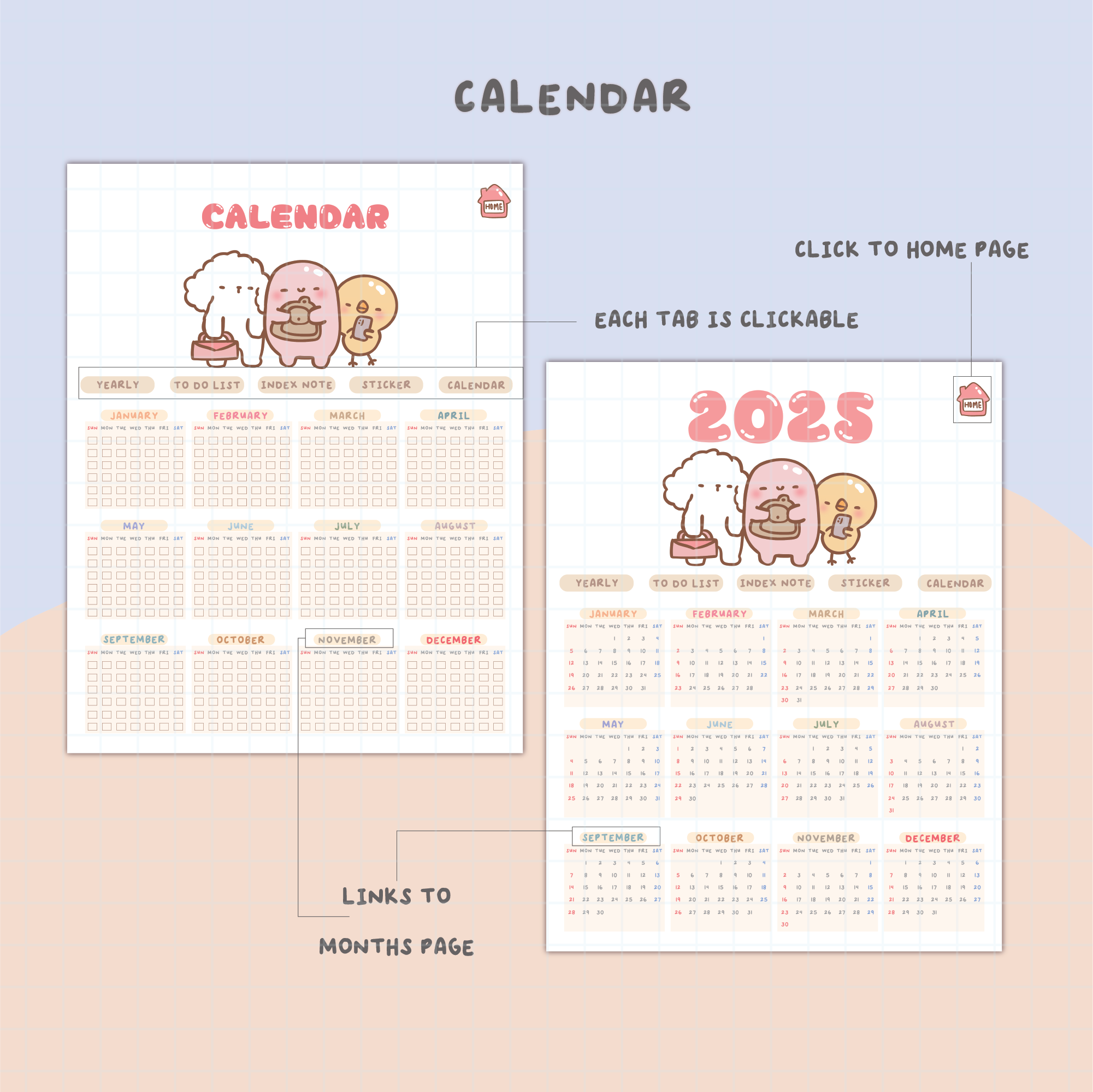 Bring joy and organization to your planning with this adorable undated Digital Calendar Planner! Perfect for year-round use, this flexible planner is designed with cute, hand-drawn illustrations to brighten up your day-to-day scheduling. Start whenever you like and reuse it every year—ideal for digital note-taking on apps like GoodNotes or Notability.